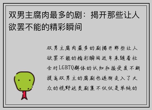 双男主腐肉最多的剧:揭开那些让人欲罢不能的精彩瞬间