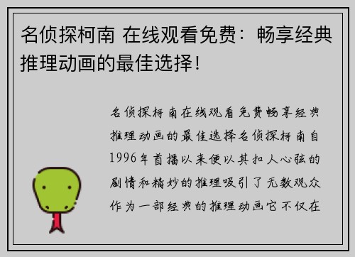名侦探柯南 在线观看免费:畅享经典推理动画的最佳选择!